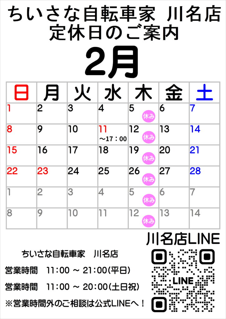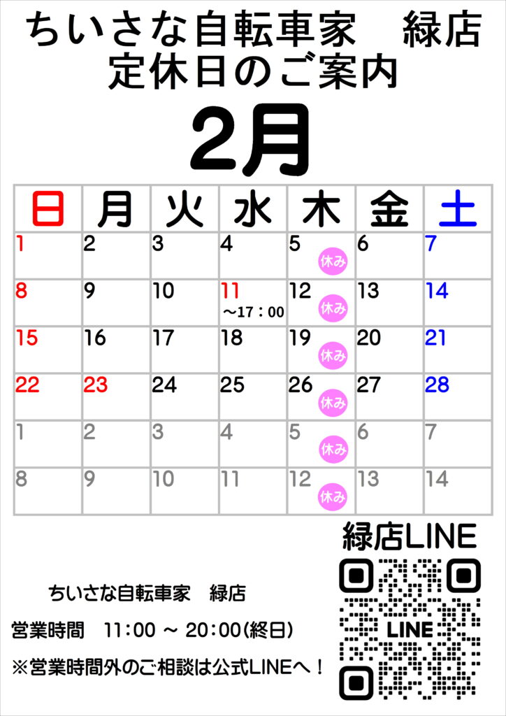 2026年2月の定休日・営業日についてお知らせいたします。