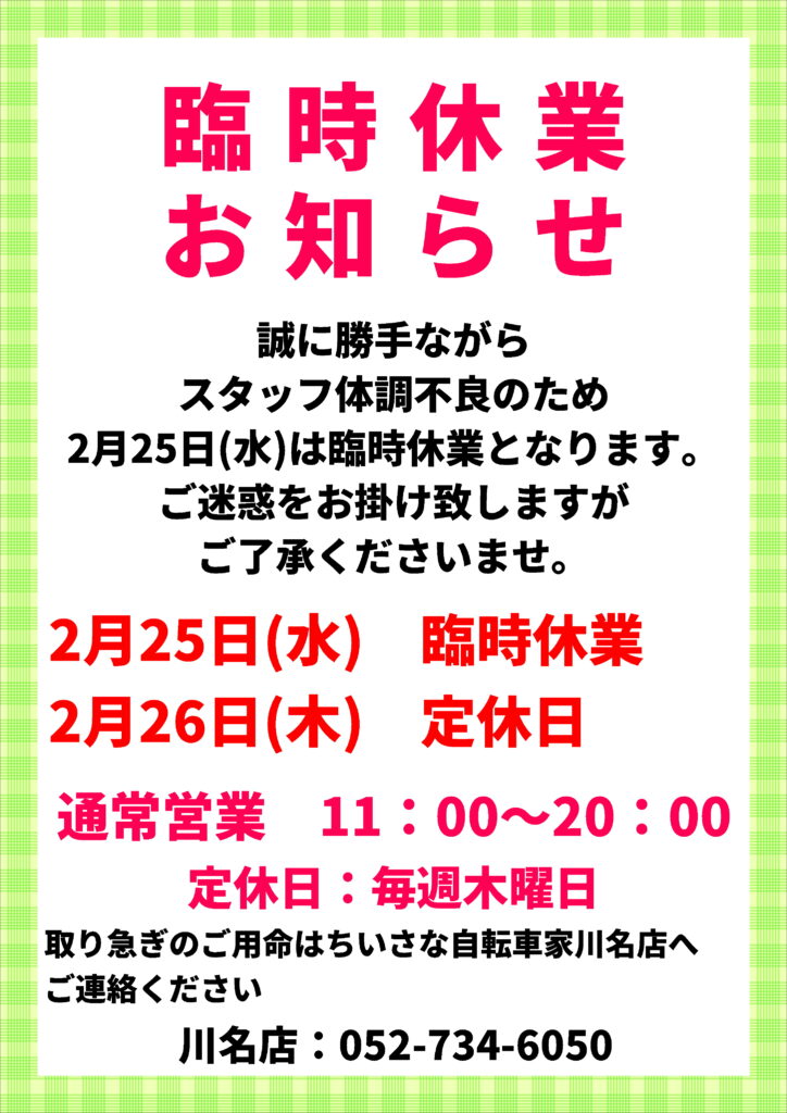 【緑店】臨時休業のお知らせ(2026年2月25日)